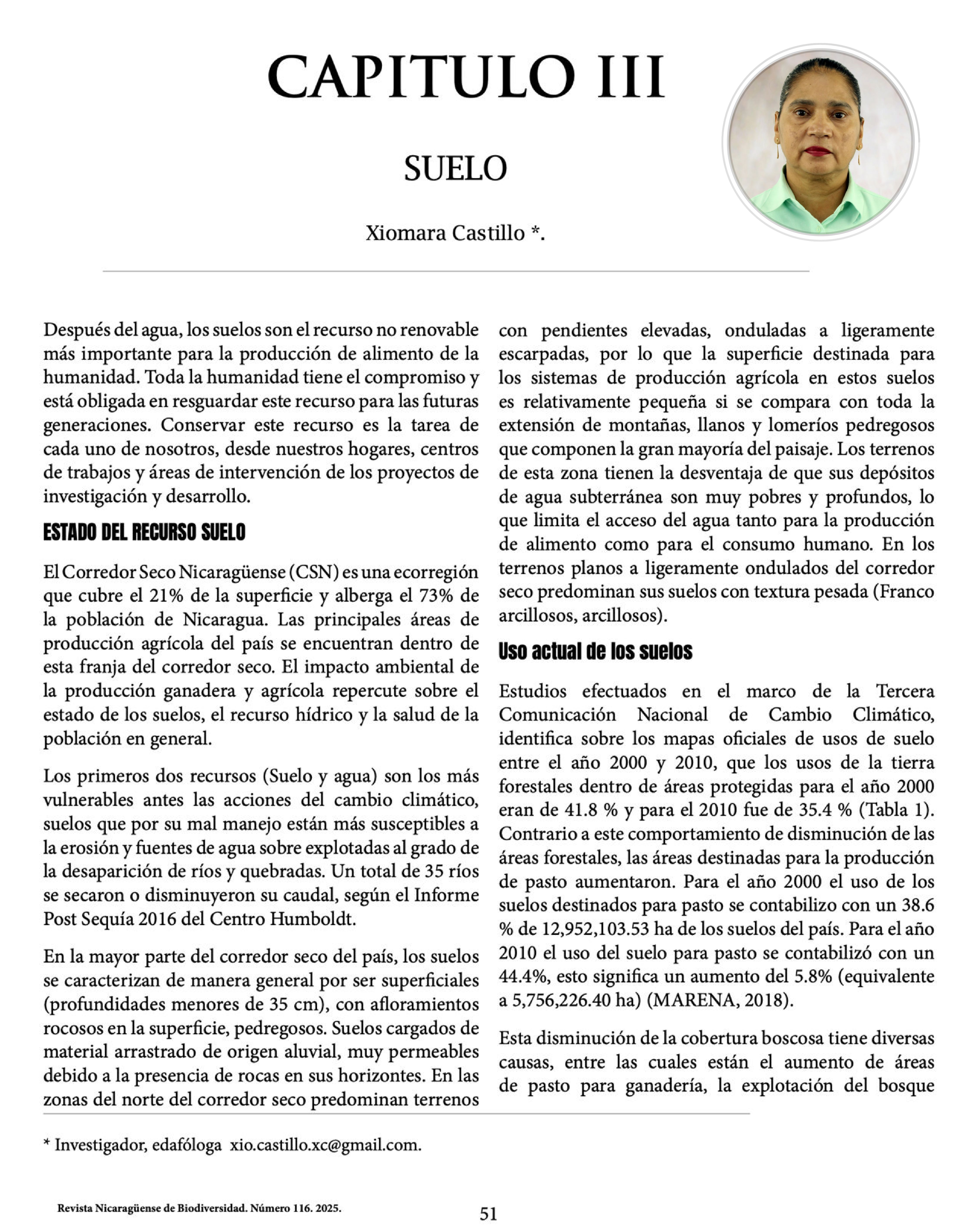 En su capítulo, la Ph. D. Castillo analiza de forma detallada el uso actual de los suelos en Nicaragua, haciendo énfasis en el Corredor Seco, una región que representa el 21% del territorio nacional y donde reside el 73% de la población. La investigadora resalta la sobreexplotación de suelos con vocación forestal y agroforestal que hoy son utilizados principalmente para actividades ganaderas y agrícolas. Este mal uso ha desencadenado procesos graves de degradación como la pérdida de materia orgánica, erosión hídrica y compactación del suelo, comprometiendo la sostenibilidad ambiental y la seguridad alimentaria.