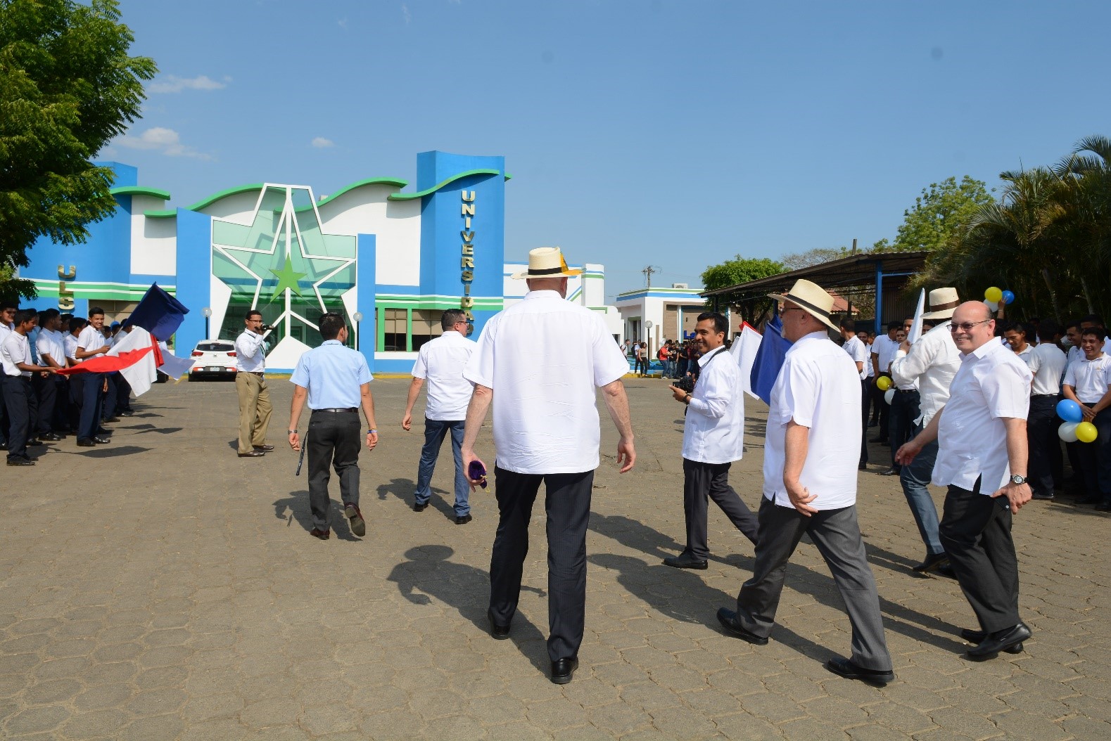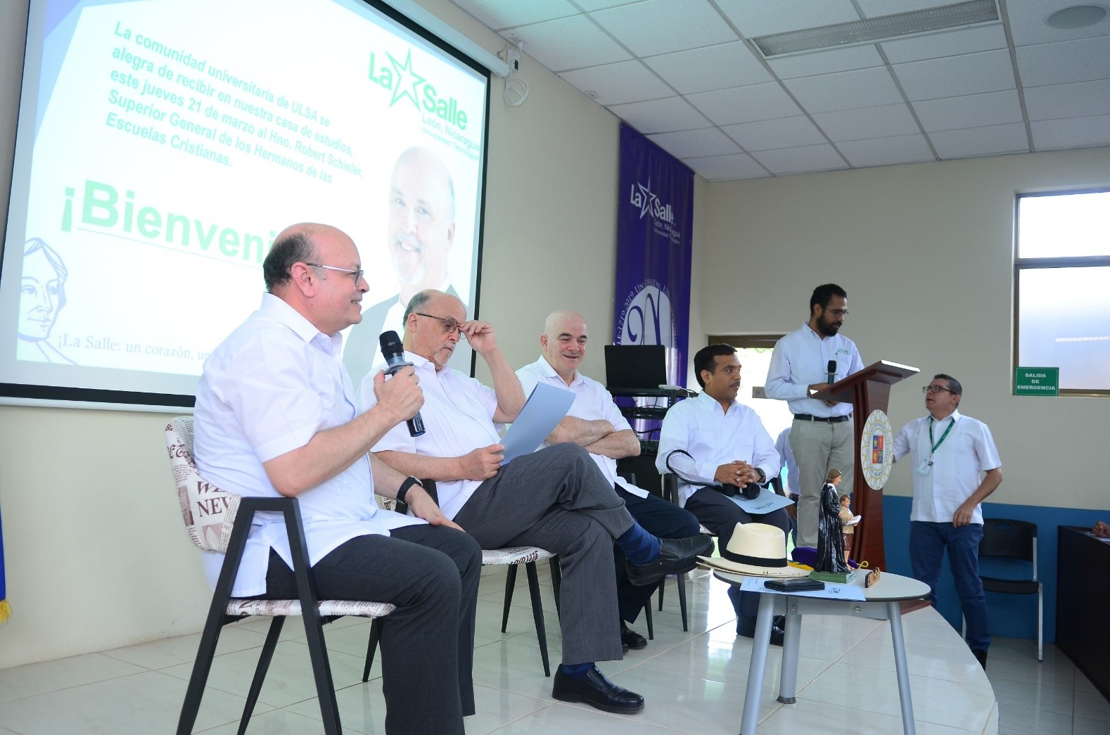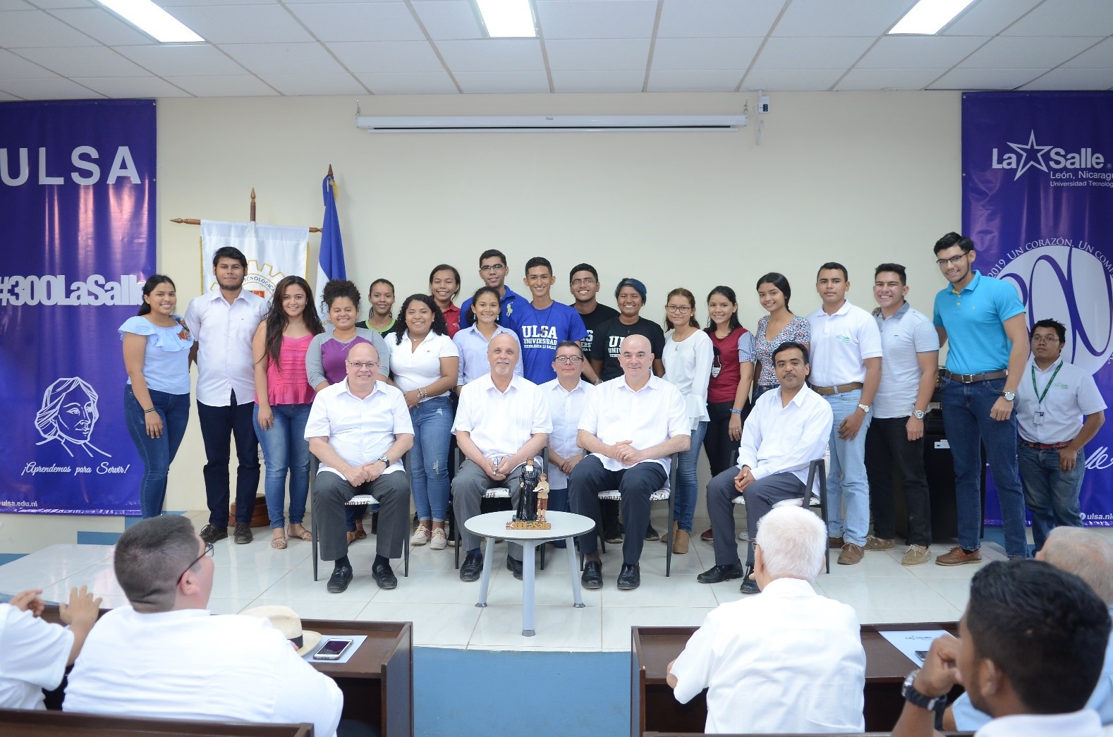 La Universidad Tecnológica La Salle en conjunto con el Instituto y la Fundación Politécnico La Salle recibieron con gran alegría y entusiasmo al Hno. Robert Schieler, Superior General de los Hermanos de las Escuelas Cristianas, quien, en compañía de su Consejero General, el Hno. Paulo Petry, han honrado al Complejo Tecnológico La Salle con su visita pastoral este jueves 21 de marzo. El Hno. Schieler fue recibido por la comunidad educativa de ULSA, IPLS y FPLS con entusiasmo a través de muestras folklóricas, coloridas y con la algarabía que caracteriza a los jóvenes nicaragüenses, sobre todo porque es la primera vez que el Superior General en su período visita las obras de León-Nicaragua. Después del eufórico recibimiento el Hno. Schieler se dispuso a reunirse con las comunidades de hermanos de la ciudad de Managua y León en la sala de consejo universitario de ULSA. Posterior a ello el Superior General pasó a compartir con una significativa representación de la comunidad educativa del Complejo Tecnológico, en los que se encontraban los grupos pastorales, docentes, administrativos y autoridades de las obras. El Hno. Manuel Orozco, Rector de ULSA brindó las palabras de apertura, aprovechando el espacio para confirmar el compromiso de la comunidad de ULSA a seguir donando las energías, los corazones, las manos y la creatividad para contribuir a la regeneración del tejido social nicaragüense. El Hno. Schieler logró a través de sus saludos animar a la comunidad educativa de ULSA a continuar siendo parte de una nueva realidad y que tomen a San Juan Bautista de La Salle como ejemplo de que las cosas imposibles se transforman en realidades latentes. Las palabras de cierre del Hno. Alberto Mairena, Visitador del Distrito de Centroamérica- Panamá, fueron para alentar a las comunidades educativas a seguir acompañando a los estudiantes en su formación integral. Estos gratos y memorables momentos quedaron plasmados a través de las fotografías oficiales con los grupos presentes. Para finalizar la visita el Hno. Schieler, en compañía del Hno. Petry y el equipo distrital realizaron un pequeño recorrido por el laboratorio de Energías Renovables y Redes Inteligentes (EcoLAB), así mismo por Robótica de ULSA, con el objetivo de apreciar el crecimiento y recursos que ha logrado la universidad en su desarrollo integral, pese a ser una de las universidades más jóvenes de la red de universidades Lasallistas. |