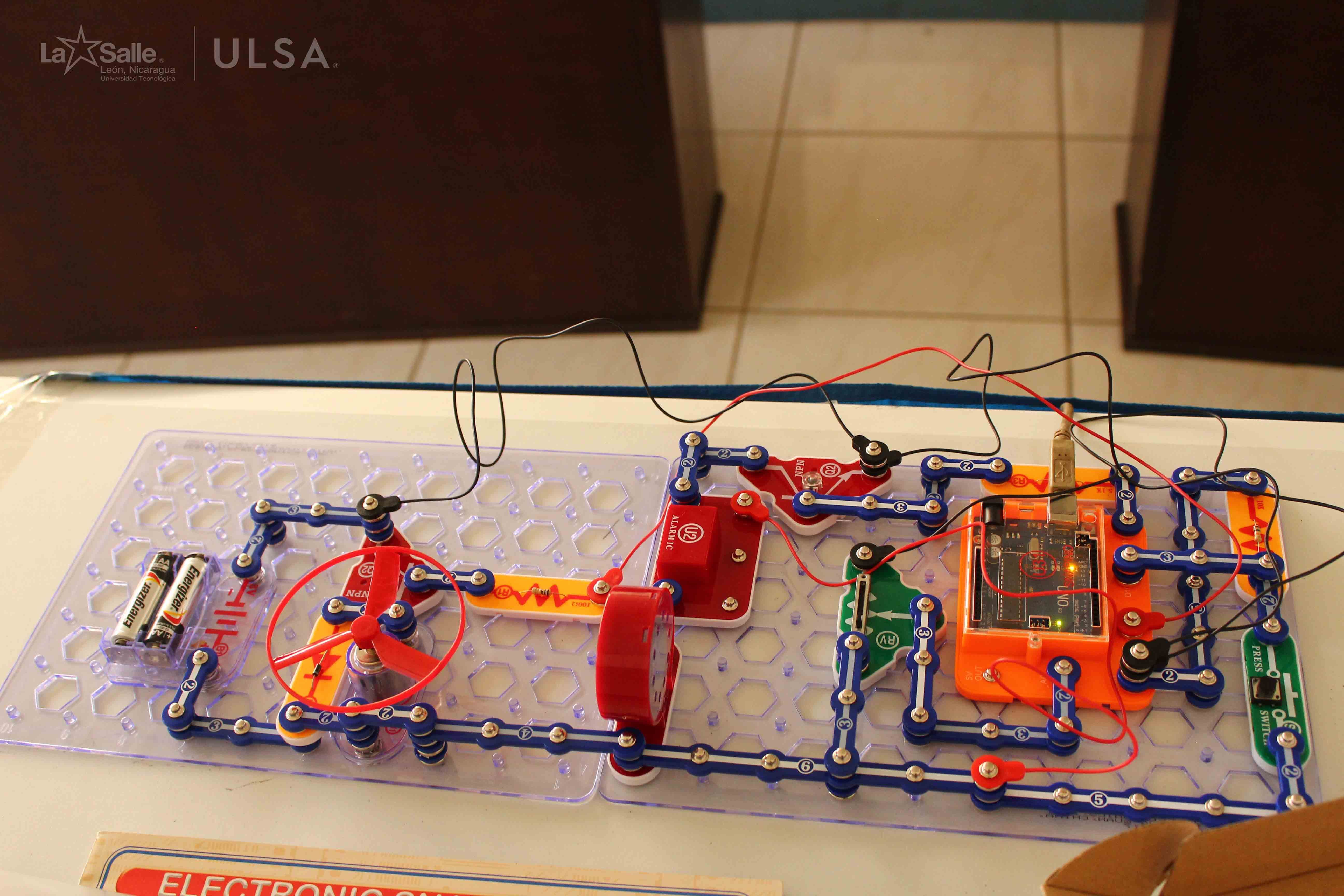 También se aprovechó para mostrar un proyecto electrónico con Arduino el cual trataba de un sistema que usa un motor para hacer girar aspas y con un controlador de frecuencia acelerar o disminuir la velocidad, la cual en caso de sobrepasar las rpm permitidas se activa una alarma que indica un paro en el proceso. Todos los componentes que se usaron en este proyecto forman parte de una donación del capítulo EDS de IEEE.