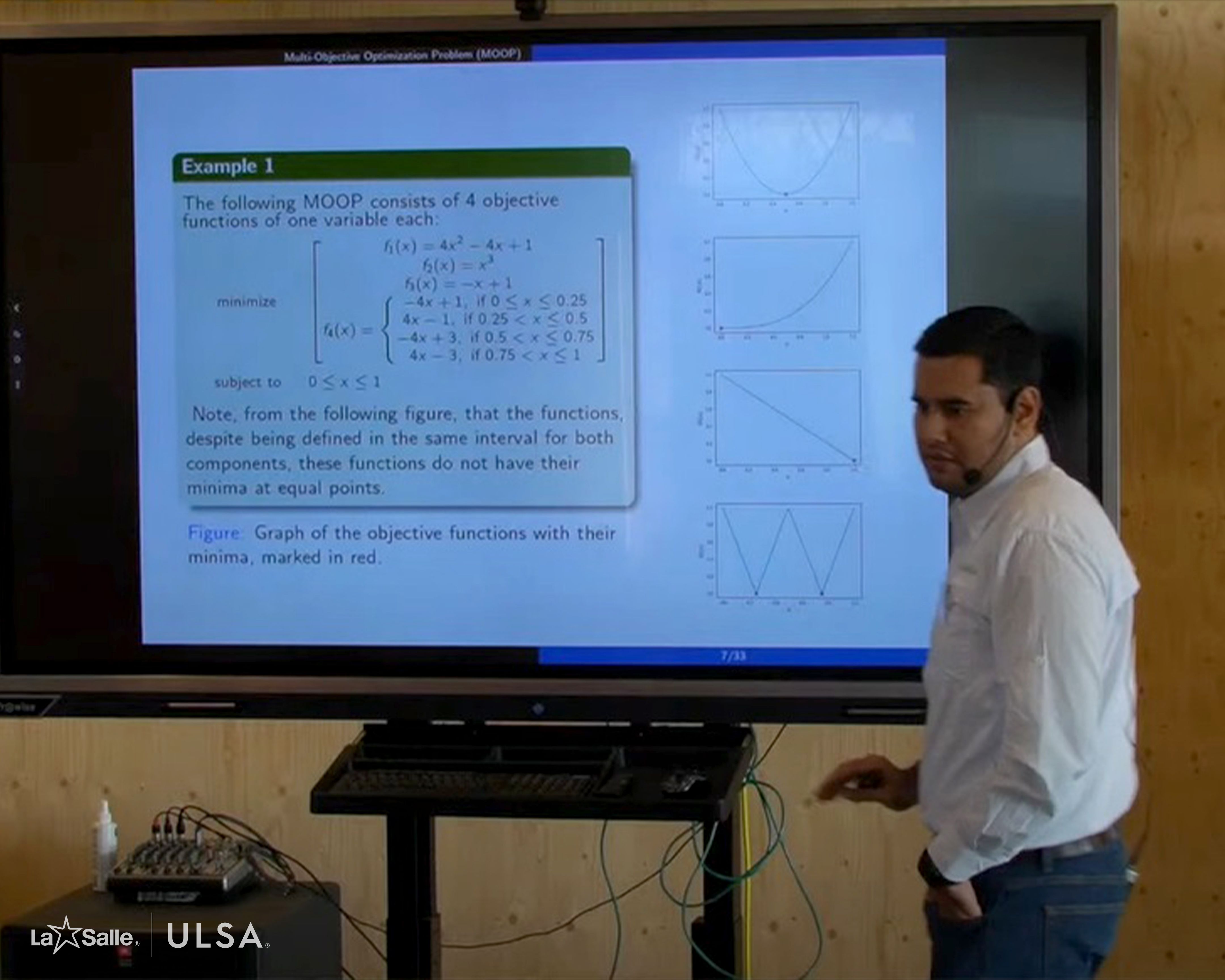 La charla consistió en una exposición sobre qué son los problemas de optimización multiobjetivos, conocidos como MOOP, por sus siglas en inglés. Estos son problemas matemáticos en los que se quiere optimizar más de una función objetivo a la vez; peculiaridades de estos problemas que los hacen realmente difíciles de resolver y algunos enfoques para darles solución.