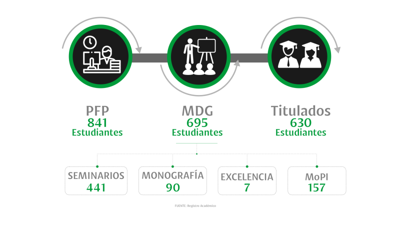 Como parte del proceso de finalización académica, los estudiantes culminan su formación cumpliendo con las prácticas de formación profesional. Posteriormente, seleccionan e inscriben su modalidad de graduación, la cual puede incluir seminarios, monografías, excelencia académica o proyectos de investigación.